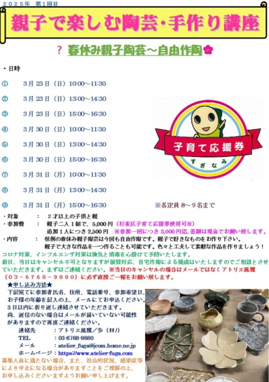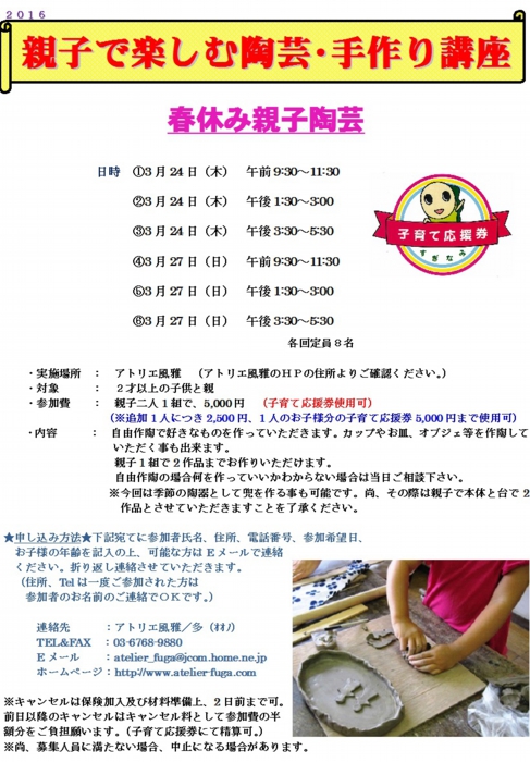・内容 : 恒例の春休み親子陶芸は今回も自由作陶です。親子で好きなものをお作り下さい。