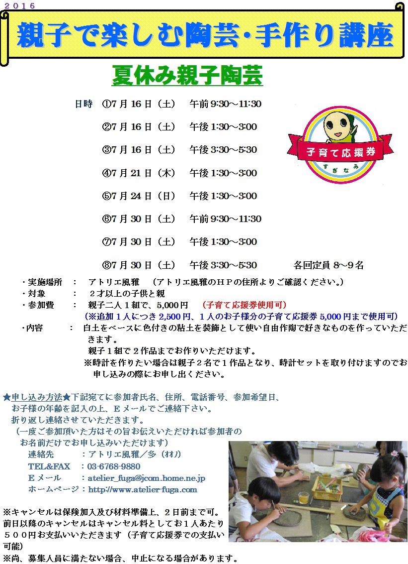 ・内容 : 恒例の夏休み親子陶芸は今回も自由作陶です。親子で好きなものをお作り下さい。