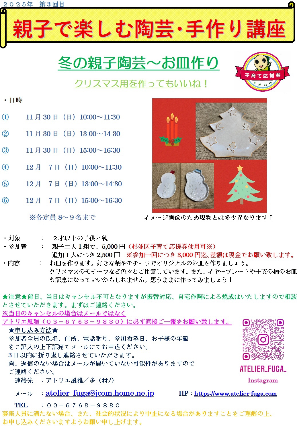 ・実施場所 : アトリエ風雅 (アトリエ風雅のHPの住所よりご確認ください。)